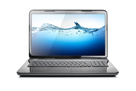 将来壁紙と白い背景に分離されたモダンな黒の光沢のあるノート パソコン の写真素材 画像素材 Image
